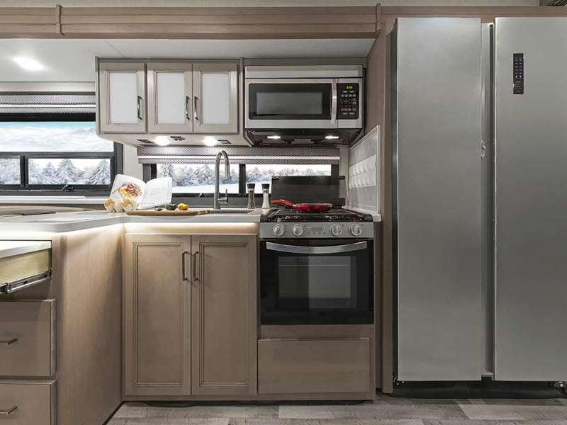 Sleeps 5 Slides 2 Length 36 ft 11 in Ext Width 8 ft 3 in Ext Height 12 ft 4 in Int Height 7 ft Interior Color Hilton Head, Nantucket Blue II Exterior Color Partial Paint; Granite Peak, Silverstone, Full Body Paint; Great Falls, Morning Rain Hitch Weight 8000 lbs GVWR 22000 lbs Fresh Water Capacity 50 gals Tire Size 22.5" Furnace BTU 35000 btu Generator Onan RV QG 5500 Gas Fuel Type Gasoline Engine 7.3L V8 Chassis Ford F-53 Horsepower 335 hp Fuel Capacity 80 gals Wheelbase 242 in Number Of Bunks 1 Available Beds King Torque 468 ft-lb Refrigerator Type Side by Side Cooktop Burners 3 Shower Size 30" x 36" Number of Awnings 1 LP Tank Capacity 88 lbs Water Heater Type Tankless Basement Storage 117 cu. ft. TV Info LR 40" LED Smart TV, BR 32" Smart LED TV, Ext. 32" on Swivel w/ Bluetooth Awning Info 17' Patio Power w/Integrated LED Lighting Washer/Dryer Available Yes Gross Combined Weight 26000 lbs Shower Type Standard Electrical Service 50 amp Solar Wattage 100 watts Similar Floorplans